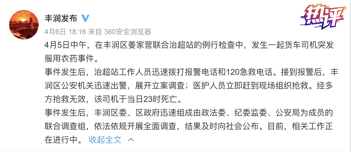 日前,河北一名货车司机途经唐山市丰润区超限检查站时,因北斗车载终端处于掉线状态,被罚款2000元并扣车。随后,该司机服农药自杀身亡。事件发生后,当地成立联合调查组。